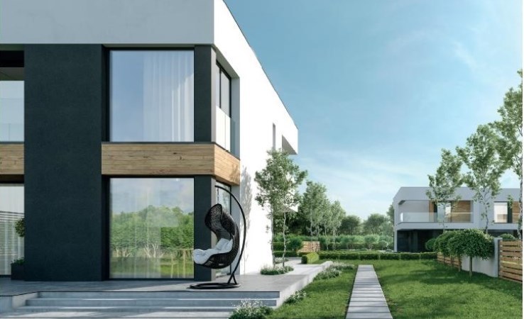 Domy wyróżniają się nowoczesną architekturą, która jest nie tylko funkcjonalna (duże przeszklenia), ale także miła dla oka – na elewacji tynk połączono z drewnem elewacyjnym i kamieniem naturalnym.