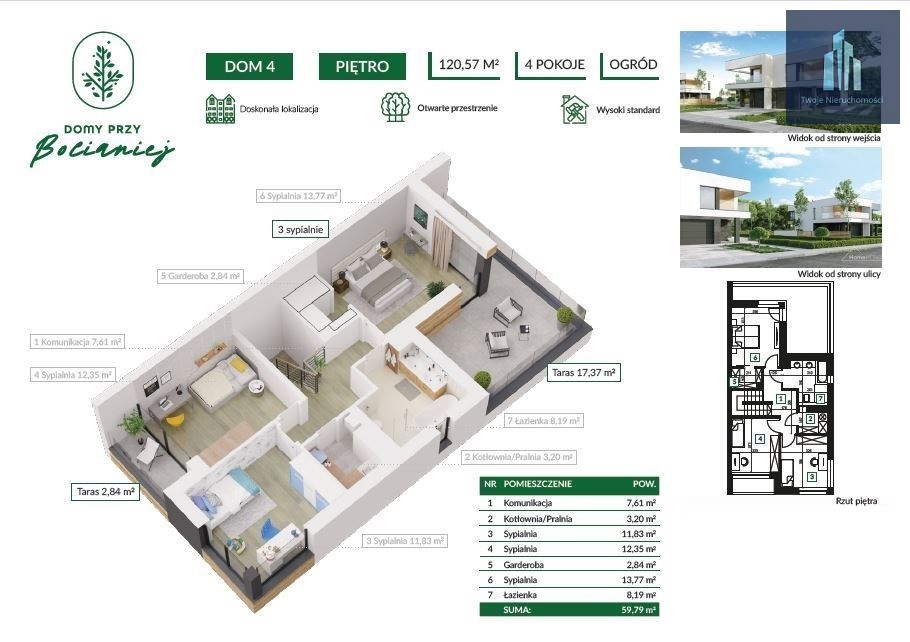 Na piętrze znajdziecie Państwo 3 sypialnie : jedna z garderobą i wyjściem na duży taras, drugą z balkonem, a trzecią z rogowym dużym oknem oraz łazienkę i kotłownię.