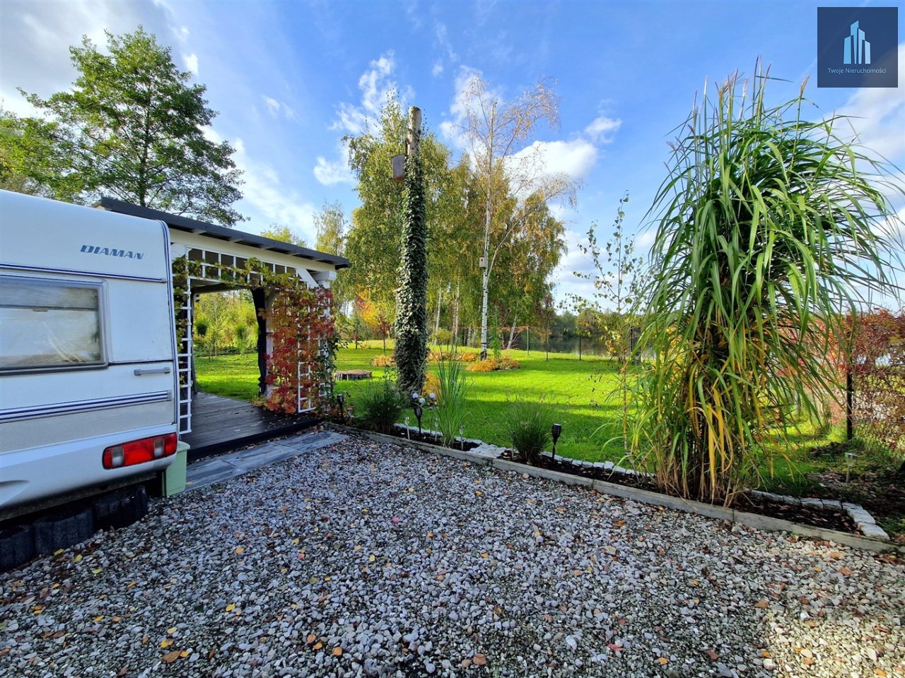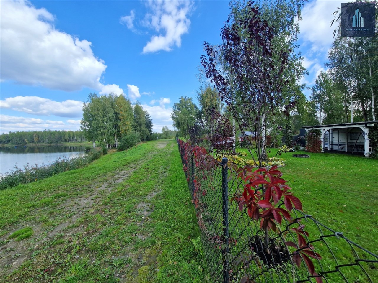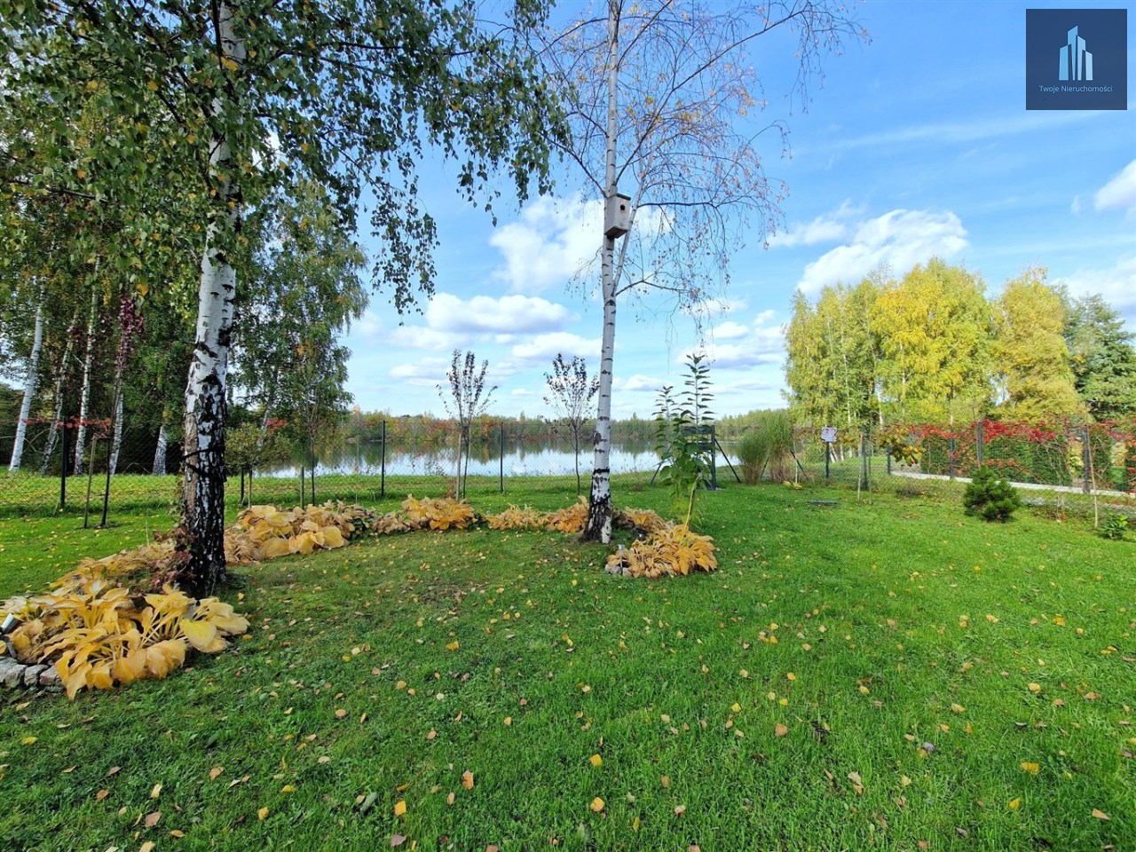 Działka jest pięknie utrzymana, z licznymi nasadzeniami i zadbaną zielenią. Z tarasu zaś rozciąga się malowniczy widok na wodę i pobliski las.