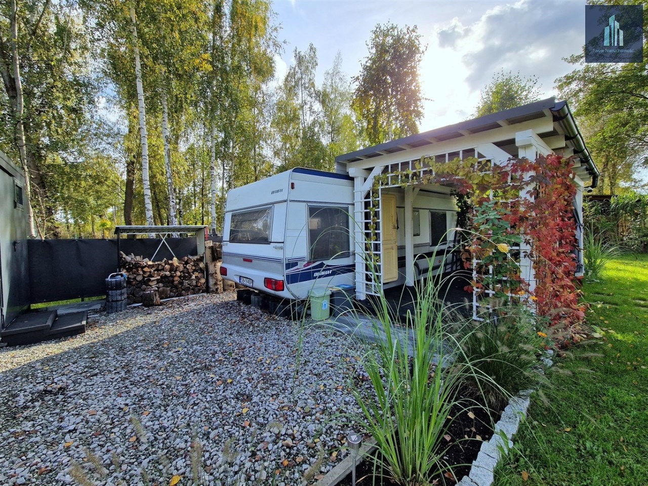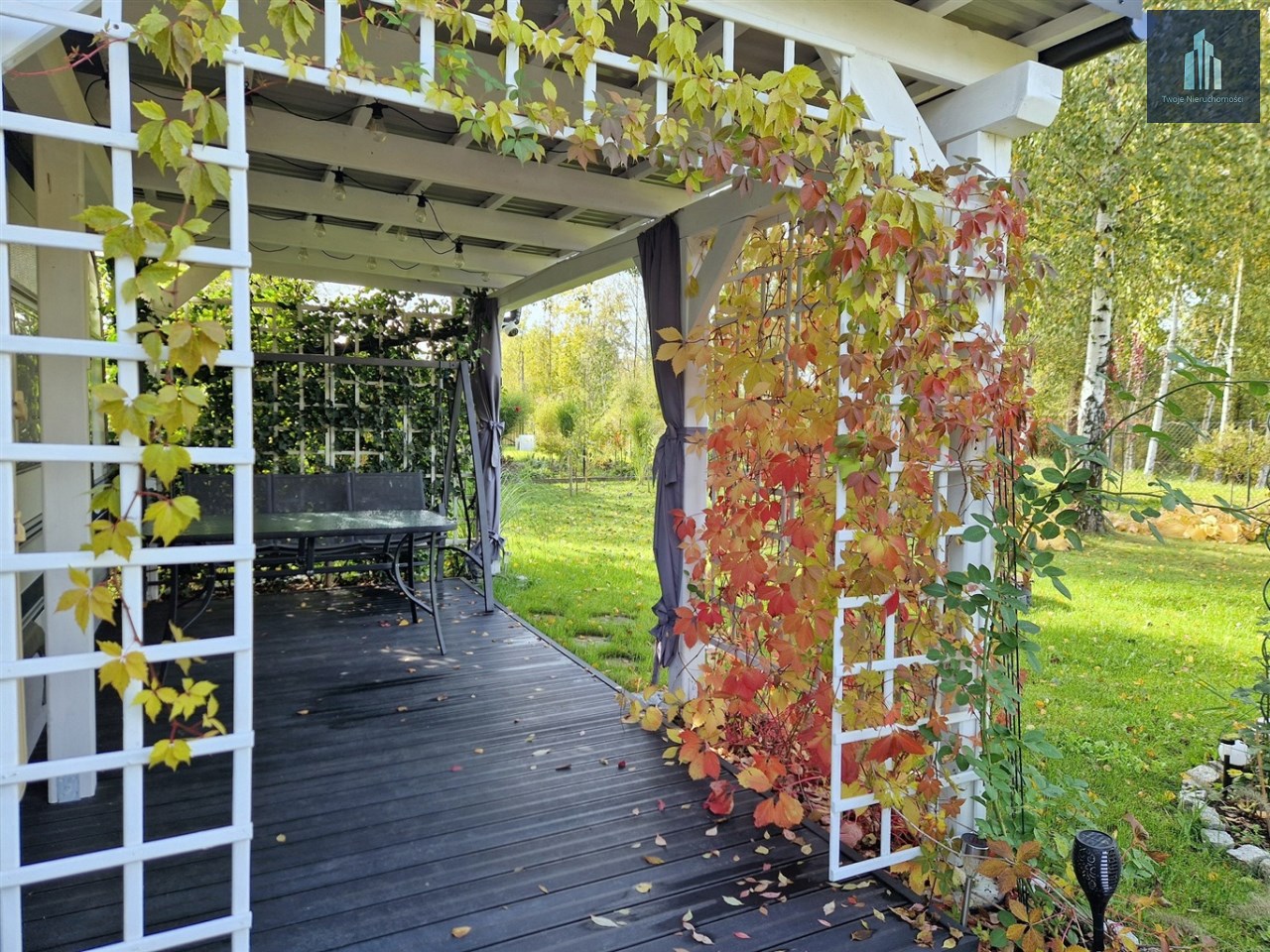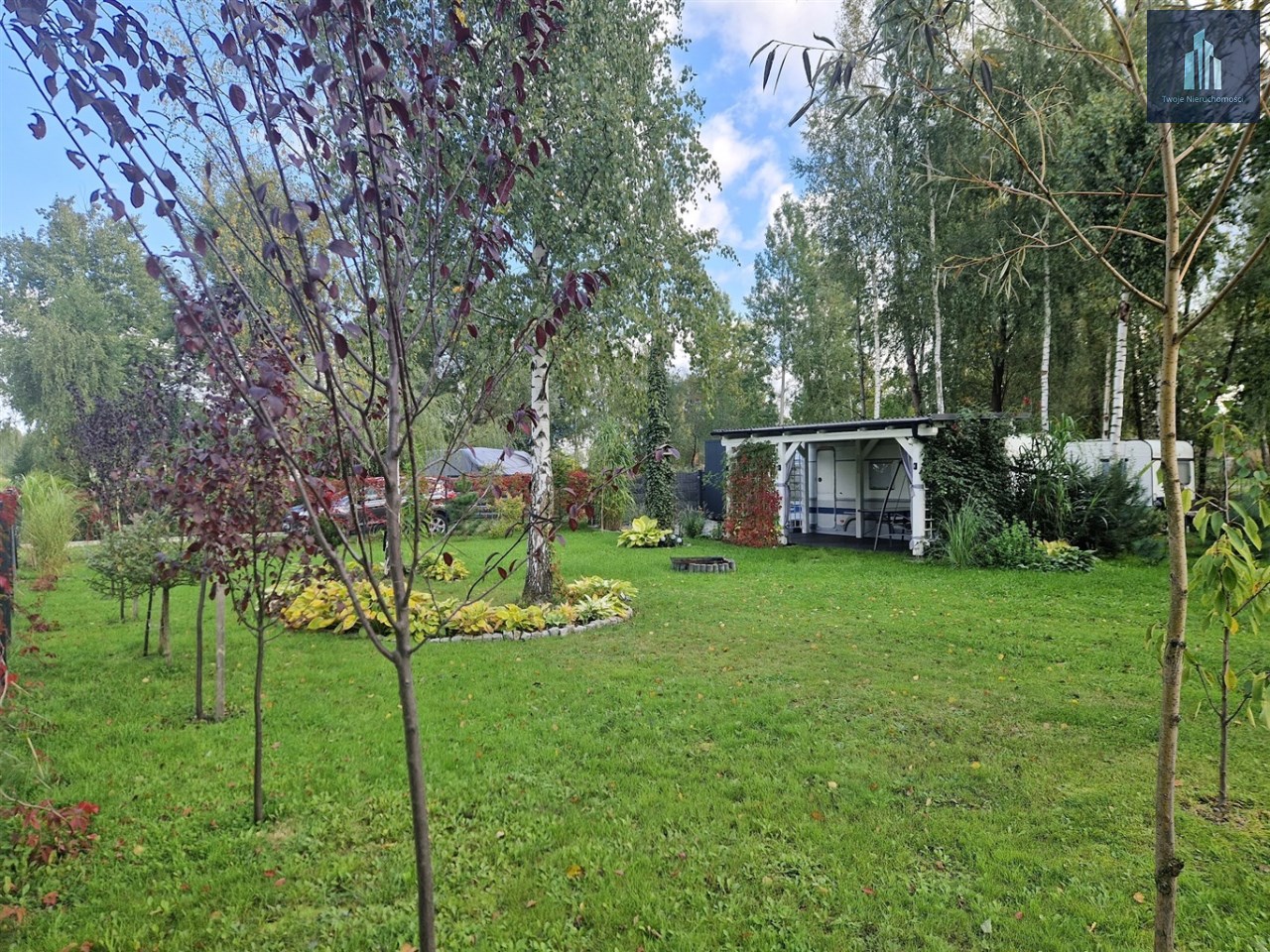 Działka jest pięknie utrzymana, z licznymi nasadzeniami i zadbaną zielenią. Z tarasu zaś rozciąga się malowniczy widok na wodę i pobliski las.