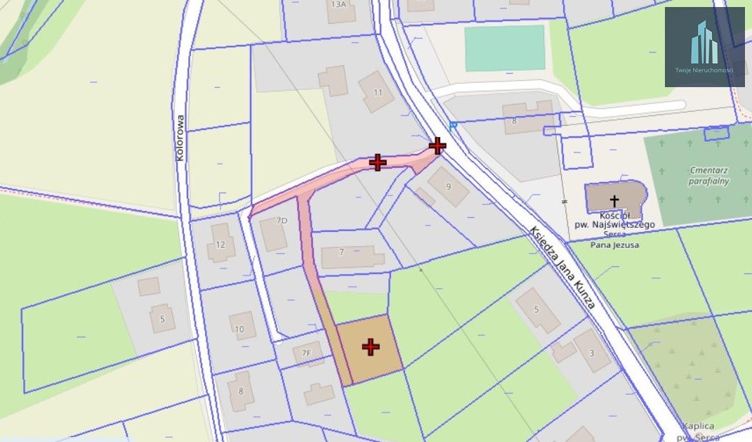 Dojazd: Działka ma dostęp do drogi publicznej Ks. Jana Kunza poprzez udziały w działce drogowej o szerokości 5 m. Nawierzchnia na długości ok 80 m, wymaga utwardzenia.