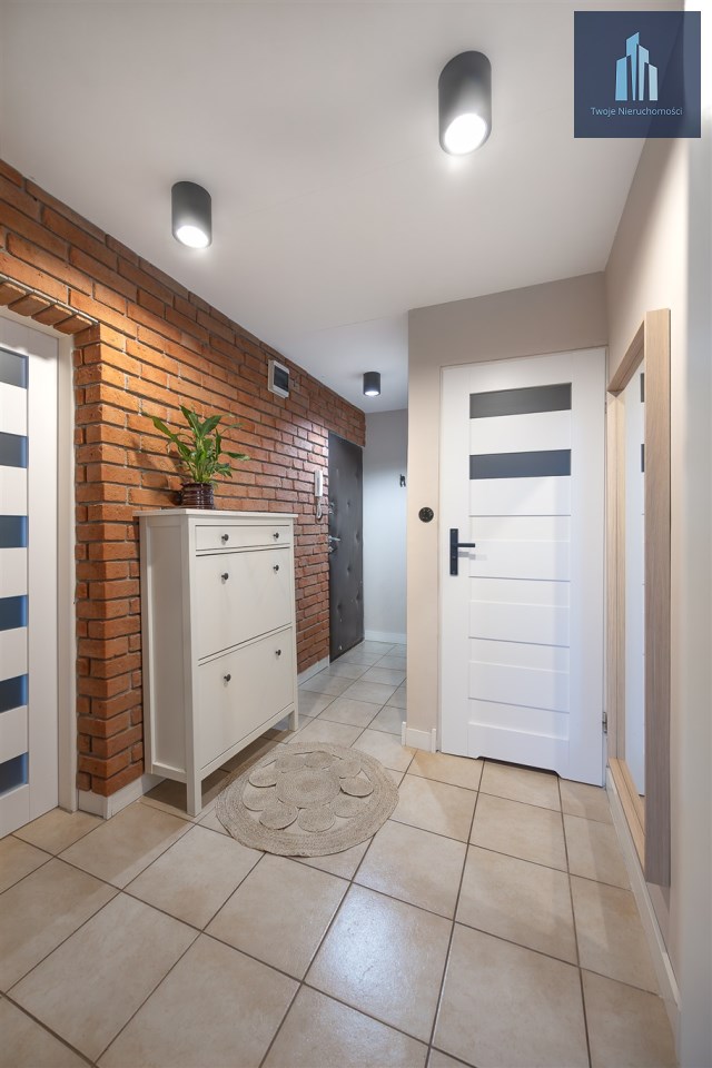 Mieszkanie urządzone jest w ciepłym, klimatycznym stylu. Wnętrze zdobi biała kuchnia, która nadaje przestrzeni, świeżości i lekkości, a ceglane ściany w przedpokoju tworzą wyjątkowy, przytulny klimat.