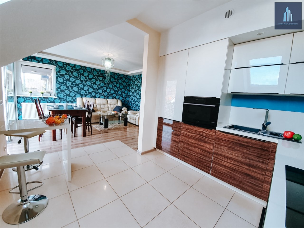 - nowocześnie zabudowana kuchnia połączonej z salonem - wyposażona w lodówkę i zamrażarkę, zmywarkę, płytę indukcyjną, piekarnik wraz z kuchenką mikrofalową, ciśnieniowy ekspres do kawy, pralkę